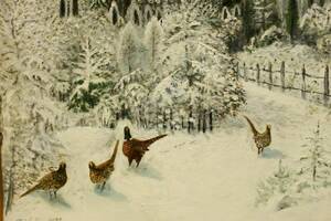 T, Wallin, fasaner i vinterlandskap, signerad, ramens innermått: 55x64.