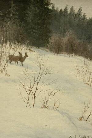 Arvid Andersson (f. 1934), rådjur i snö, signerad, 26x22. Arvid Andersson, svensk målare född 1934.