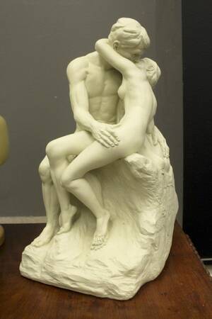Anders Jönsson, efter, skulptur, patinerad gips. "Kyssen". Osignerad. Patinerad gips, höjd 45,5 cm. Ytsmuts, slitage, skrapmärken, ett par små nagg på basen med färgbortfall. Läs mer...