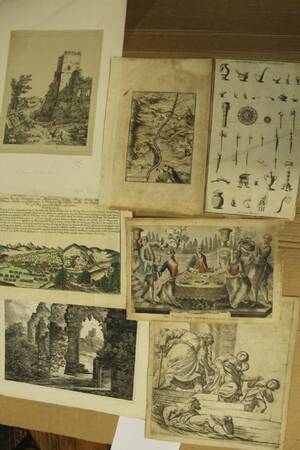 Två mappar med grafiska blad samt tre med passepartout, de mindre bla ca 45 x 35 cm Konditionsrapport - Ej fullständigt genomgångna, någon gulnad, någon Läs mer...