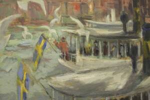 Charles Sjöholm (f. 1933), Sverige. Hamnmotiv. Signerad. Olja på pannå, 45x53 cm, yttermått inklusive ram: 60x70 cm. Charles Sjöholm, född 1933 i Stockholm, svensk målare, Läs mer...