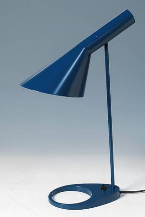 Arne Jacobsen. AJ bordlampe lakeret i farven 'Petroleumsblå'. Trykafbryder på fod. Formgivet 1957. Fremstillet hos Louis Poulsen. H. 56 cm. I original emballage med nummercertifikat.