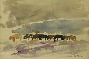 Thage Nordholm (1927-1990), hästar i snö, 19x27. Thage Nordholm, svensk målare född 1927, död 1990.