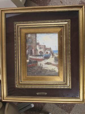 oljemålning på pannå, 3 stycken, stadsmotiv med figurer, signerad, 20x40, rammått 40x60, dansande kvinnor framför hus, 32x31, signerad, stadsmotiv med figurer, 34x16, signerad Läs mer...
