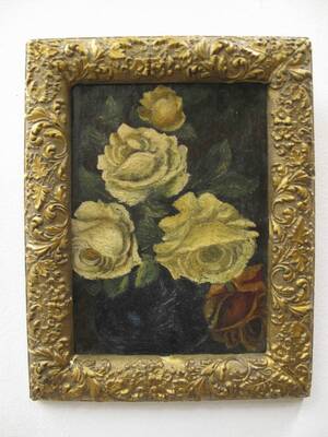 Oljemålning på pannå. Daterad 1843. Stilleben med rosor. 31x23 cm. Smärre färgbortfall, krackeleringar. A tergo märkt Blomqvist Kunsthandel. Läs mer...