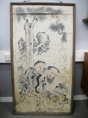 Med sigill i rött, samt kalligrafi. Fåglar i blommande trädgård. Färg och tusch på papper. Motivets mått 38x145 cm. Går att rulla. Slitage, skador. En Läs mer...