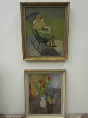 2 st, Frits Sjöström, 44 x 33, Stilleben & kvinna i gungstol.