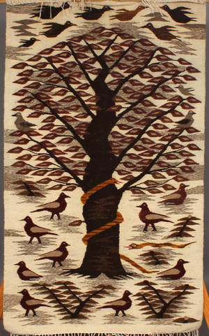 Ubekendt kunstner. Billedtæppe af uld. Usign. 197x117 cm. Monteret på med træstokke i hver ende- til ophæng på væg.