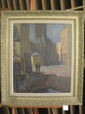 Einar Krüger, Stadsmotiv med kyrka, 61 x 51. Einar Krüger, svensk målare och konsthantverkare född 1910 i Halmstad, död 1988.