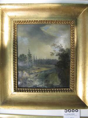 OIDENTIFIERAD KONSTNÄR (1800-talets första hälft): Landskap med fors, bär signatur, olja på pannå, ca 19x29 cm. Färgbortfall. Läs mer...