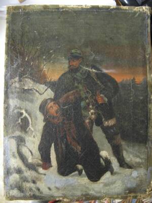 signerad, Jaktvänner 1800-tal, 31x24 [skada; spricka; repa; nagg eller slitage].