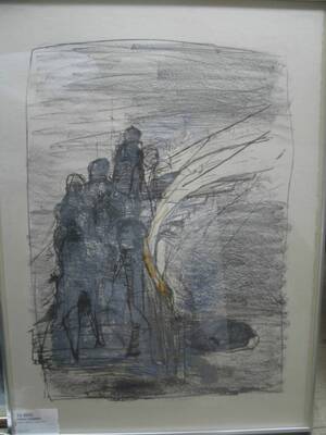 Staffan Hallström, Tidningsläsarna. Färglitografi, signerad 19/125. P. 49 x 40 cm. Ej examinerad ur ram, fuktfläck. Läs mer...