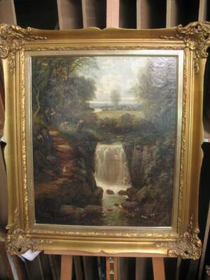 Sign E Priestley, 1800-tal, Pastoralt landskap med vattenfall 62x52 (dukskador).