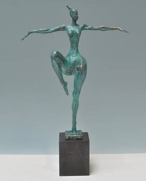 Abstrakt figur af grønpatineret bronce. Sokkel af marmor. Fra skulpturserie bestående af 5 forskellige. H. 56cm. inkl sokkel. Fremstår i original emballage.