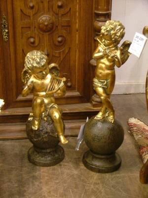 Ett par, i form av änglar, gjutmetall, med marmorsockel, höjd 53 cm, smärre slitage (metall något anlupen). Läs mer...