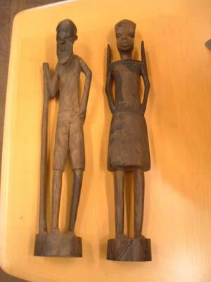 Längd på masker 51 resp. 68 cm. Höjd på skulpturer 38 cm.Två av skulpturerna saknar en arm. Läs mer...