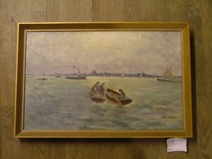 Hilmer Eriksson, Fiskare i hamninlopp, 40 x 64. Hilmer Eriksson, svensk bildkonstnär född 1881, död 1962.