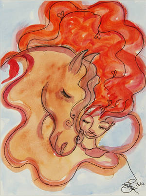 Lina Murel Jardorf. 'I et med hesten'. Akvarel på papir. Sign. monogram 2010. Lysmål 31 x 23 cm. (42,5 x 33,5) Der medfølger et signeret eksemplar af bogen 'Kærlighed...Selve livet' af 'Styrke og sårbarhed. Om Modig er et af de ord, der falder en ind, når man oplever kunst af Hun stikker ikke noget under stolen. Hun udleverer sig selv så meget i sin kunst, at man kan blive helt ængstelig på hendes vegne: Kan hun håndtere at trække så stærkt på sit inderste, uden at gå i stykker på det? Først og fremmest er hun en ægte ekspressiv kunstner. Hun føler virkelig for det, hun laver, og der er intet filter mellem følelsen og det færdige resultat. Deri ligger sårbarheden ? og styrken i hendes kunst. Det må være derfor, at hendes malerier berører sin beskuer på denne helt særlige måde. Det er som at blive trukket ind i en fortrolig samtale, hvor det andet menneske pludselig åbner sig fuldt og helt og fortæller hemmeligheder fra d