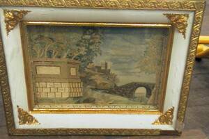 TAVLOR (omkring 1800): (2) Landskap, sidenbroderi med applikation, rammåt ca 24x30 cm. Smärre skador. Läs mer...