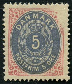 Avslutade auktioner liknande AFA 24: 1875. Tofarvet, 5 Øre, 3.Tryk, Position A97. Tryktilfældighed: Mangelfuld farvepåføring i NØ hjørne. Postfrisk. Attest Lasse Nielsen (1990).