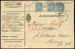 Avslutade auktioner liknande AFA 36: 1884. Våbentype, 10 Øre, 11.Tryk, Position B72,B81-82 (enkelt og par). Adressebrev for 1 opkrævningspakke sendt fra KJØBENHAVN 22.10. til Askeröd Station, Sverige. Transitstemplet MALMÖ 23.10.1890. ►