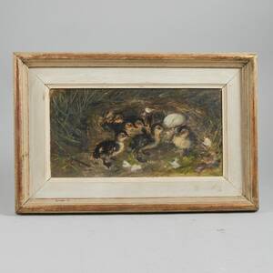 Oidentifierad konstnär. Signerad, Fågelungar. Olja på pannå, 21x38, yttermått inklusive ram: 35x54 cm.