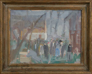 Ragnar Person, "Gårdsmusikanter". Signerad RP samt Ragnar Person, a tergo. Olja på pannå, 50 x 61 cm. Ramen bemålad av konstnären. Helhetsintrycket är gott. Läs mer...