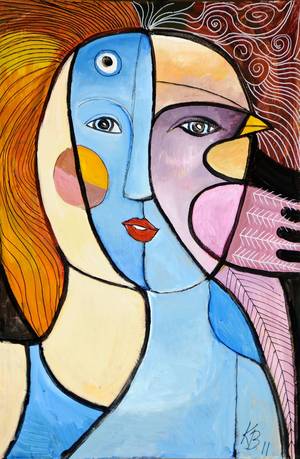 Kirsten Brok. Komposition med kvindeansigt og fugl, akryl på lærred. Sign KB. 11. 120 x 80 cm.