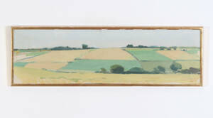 Oljemålning på duk. Skånskt åkerlandskap. 35x120 cm.