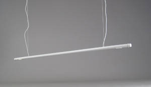 Cecilie Manz. Pendel af hvidlakeret rundstål og stålrør, ring af støbt akryl. L. 90 cm. Mål i pakket tilstand: 96 x 19 x 11 cm. Fremstillet hos Lightyears, model Mondrian. Fremstår ubrugt i original emballage. Den gennemsigtige ring af støbt akryl isolerer varmen fra det yderste led på lampehovedet. Når lampen tændes, bliver ringen oplyst og indikerer, hvor man kan styre lyset. Pendlen har to lyskilder. Selve lampehuset har en reflektor, der både leder varmen væk og øger lysudbyttet. Effekten forstærkes ved brug af halogenpære med indbygget reflektor.