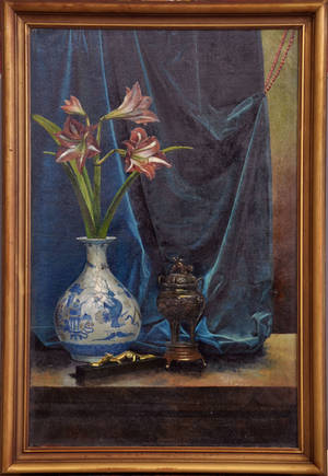 Ubekendt kunstner. Blomsteropstilling. Olie på lærred. 97 x 62 cm (109 x 74). Fremstår med lille reparation, hårdt renset lærred samt små afskaldninger på lærred.