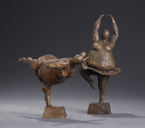 To skulpturer af støbt bronze i form af ballerinaer, med runde former stående i forskellige positurer. Højde 23 og 30 cm. Läs mer...