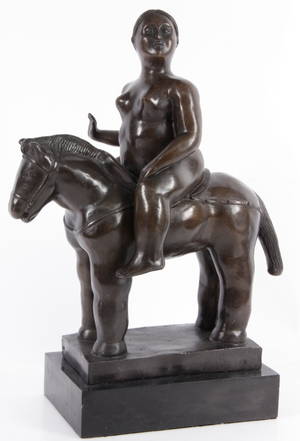 Avslutade auktioner liknande Masier: Bronzeskulptur efter Fernando Botero i form af kvinde til hest.