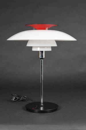 Poul Henningsen. Bordlampe PH80 med skærm af hvid akryl, top af rød/sort kunststof, forkromet stamme på sort fodstykke. H. 67 cm. Fremstillet hos Louis Poulsen. Fremstår med minimale brugsspor. NB. Snor til afbryder skal monteres.