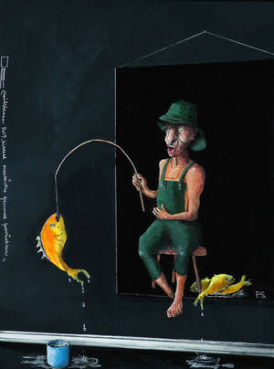 Poul Steen (f. 1945). Overdrivelse fremmer forståelsen, olie og akryl på lærred, sign. Poul Steen 2019 samt sign. med ægyptiske hieroglyffer og betitlet, ligeledes sign. på bagsiden. 80 x 60 cm. Uden ramme.