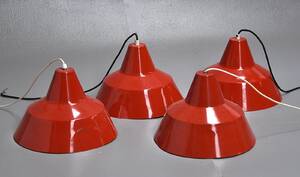 Fire værkstedspendler af rødlakeret metal. H. 23 cm. Ø 35 cm. Fremstår med aldersrelaterede brugsspor, nogle med trykmærker. (4)