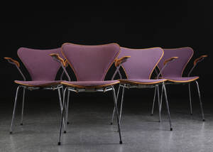 Arne Jacobsen. Et sæt på seks armstole 'Syveren'...