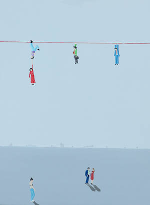 Jens Ulrich Petersen (f. 1947). Hvad laver vi egentlig her? fra serien Snoremænd, olie på lærred, sign. på bagsiden. 80 x 140 cm. Uden ramme. Läs mer...