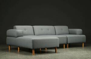 Emil Lagoni Valbak for 2UP, sofa med chaiselongue, model Float . Trepersoners sofa sammensat af tre moduler, betrukket med gråblåt møbelstof og knapper i ryg. Läs mer...
