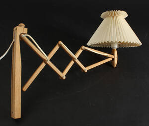 Erik Hansen for Le Klint. Sakselampe af massivt bøgetræ med plisseret skærm af plast. Formgivet 1952. Fremstillet hos Le Klint, model 324-335. L. ca.32-60 cm. Läs mer...