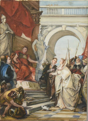 Man på tron samt par vid trappa, osignerad 61x54 cm. Oramad, slitage och ytrepor.