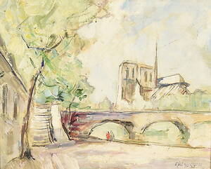 Landskap med bro och bebyggelse. Signerad 32x40 cm. Mindre ytslitage.