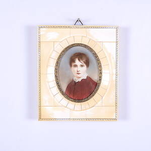 Kvinnoporträtt. Oidentifierad signatur. 8,5x6,5 cm. Mindre ytslitage. Läs mer...