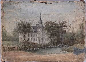 Slottsbyggnad. Osignerad. 9x13 cm. Skador, retuscher samt krackelering förekommer.