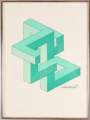 Omöjlig figur Signerad: Oscar Reutersvärd Numrerad: 10/60 Mått på bildyta: 72 x 50 cm Mått med ram: 92 x 68 cm Konditionsrapport: Mindre slitage på Läs mer...