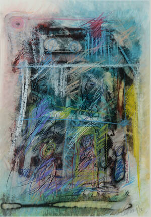 Ubekendt kunstner, 20. årh. Komposition, akryl og oliekridt på papir, utydelig sign., dat. 92. 80 x 56 (100 x 70) cm.