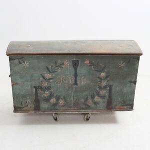 Originalmålning. Beslag i järnsmide. Välvt lock. Med blommåleri och text. Nyckel saknas. Färgslitage, maskstungen, sprickor. (Höjd 58, bredd 112, djup 52) Läs mer...