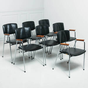 Stolar i konstskinn, kromad benställning. Stapelbara. Bruksslitage, klädsel med skador/hål.. Intryckning på klädseln efter stapling.