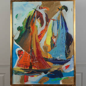 Helmut Mantel (1925-1979), Sverige. Segelbåtar. Signerad. Olja på duk, 63x94,5, yttermått inklusive ram: 69x101 cm. Helmut Mantel, tysk-svensk bildkonstnär född 1925, död 1979. Läs mer...
