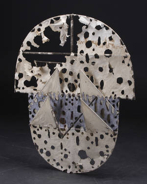 Ubekendt kunstner, skulptur fremstillet af metal og papir. Højde 144 Bredde 115 cm.